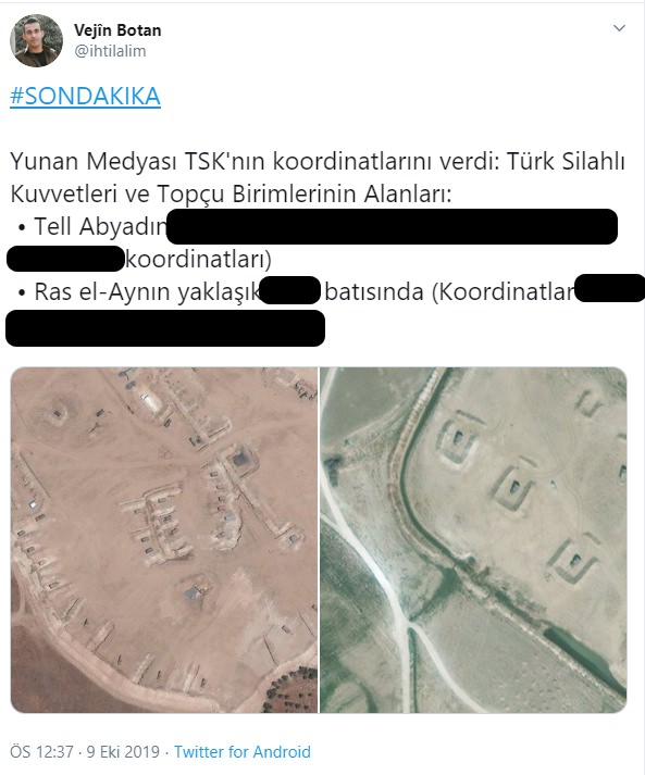 Mehmetçik, bölgedeki konuşlanmasını sürdürürken, operasyondan rahatsız olan Yunanistan medyası, TSK'nın konuşlandığı bazı bölgelerin koordinatları ve uydu görüntülerini sosyal medyadan paylaştı.