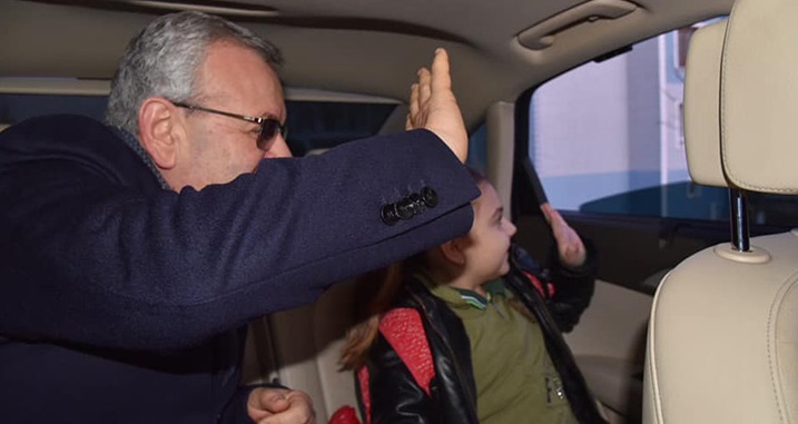 Fatih Sultan Mehmet İlkokulu birinci sınıf öğrencisi Beyza Durak'ı aracıyla okula götüren Helvacıoğlu, burada öğrenci ve öğretmenlerle sohbet etti.