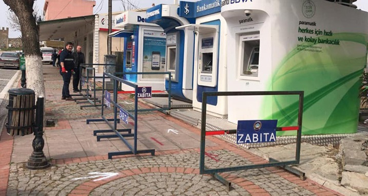 Enez ilçesinde yeni tip koronavirüs (Kovit-19) tedbirleri kapsamında bankamatik cihazları ve marketlerin önüne "sosyal mesafe şeridi" çekildi.