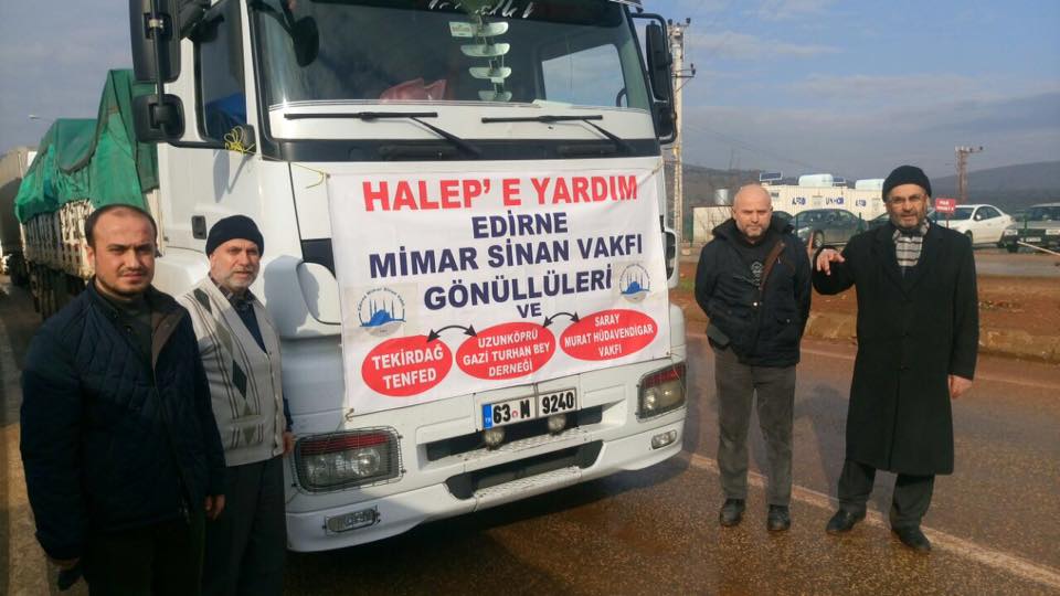 Edirne’nin tanınan sevilen ve hayır işlerinde öncü olan kanaat önderi Mimar Sinan Vakfı kurucusu Hasan Gümüş Efendi bizzat refakat ettiği ,un gıda ve kışlık maddelerden oluşan insani yardım malzemelerini Suriye tarafında bulunan insanı yardım yetkililerine teslim etti.