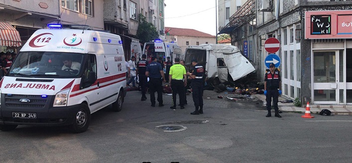 Edirne'nin Meriç ilçesinde düzensiz göçmenleri taşıyan panelvanın kaza yapması sonucunda 10 kişi yaşamını yitirdi, 30 kişi yaralandı.